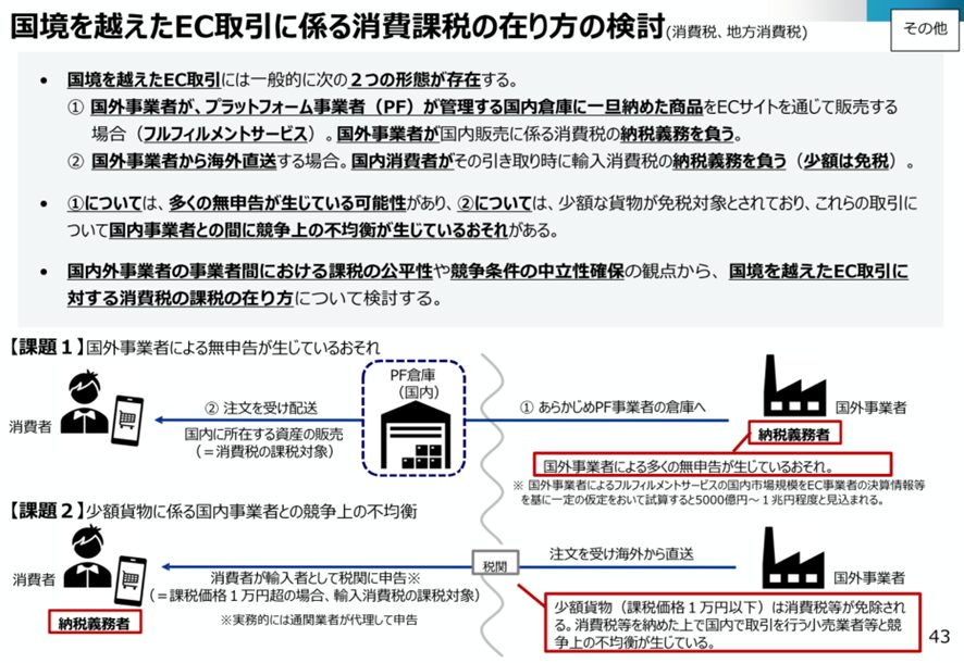 ➂ その結果、海外からの“少額越境EC(1万円以下)”が国内取引より税負担面で有利になり得る(公平性・競争中立性の観点)ため、制度見直しが打ち出された、というのが今回の大枠