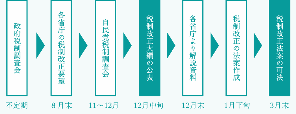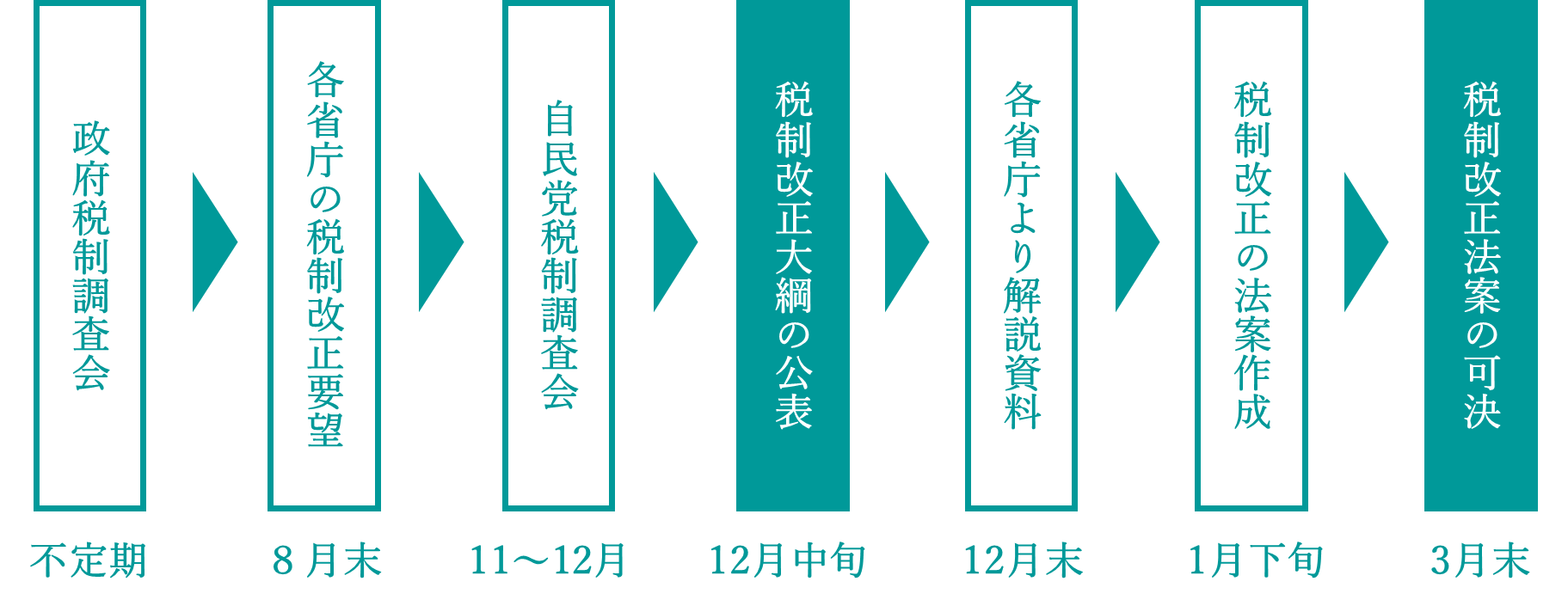 また、税制改正大綱は税制改正の骨組となるものであり、通常はこの骨組みに基づいて、2026年1月に財務省(国税)と総務省(地方税)が法案を作成、1月~3月の通常国会で過半数の承認をもって可決がされます。今回の税制改正については、与党である自民党のみでは議席の過半数を確保することができていなかったために、自民・維新・国民民主・公明の4党による合意による可決見込となります。