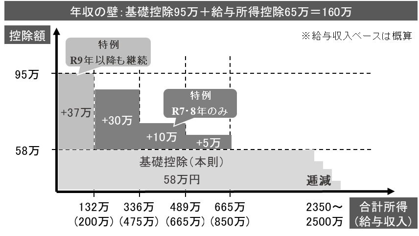 令和7年分以降の所得税について基礎控除額の上乗せ措置が講じられたが、令和8・9年分の加算額を引き上げる。本人の合計所得金額に応じた控除額は下記の通り。現行は基礎控除額58万円に対して、改正後は基礎控除額62万円に対して上乗せがされる。